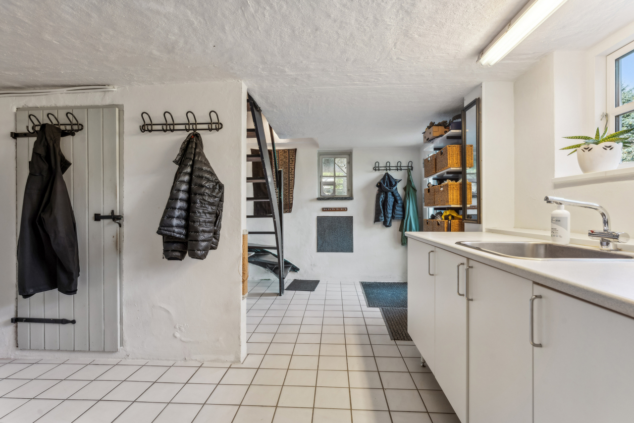 Man træder direkte ned i et af husets mest benyttede rum, det store bryggers, der lige som alle andre øst- og sydvendte rum har udsigt over bugten. Slå den: Havudsigt, fra det, der en gang var en kælder!