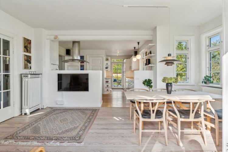 Alle inderdøre er de originale fyldningsdøre, som enten har fyldninger af træ eller af glas. Én af dem fører fra forstuen og ind i musikstuen, som vi har indrettet, så man kan sidde mageligt i sofaen og lytte til Steinwayflyglet og måske en guitar eller B&O-anlægget. Hvis det er i dagtimerne, kan man samtidig nyde udsigten gennem de franske døre til spisestuen og videre gennem den smukke karnap til Helnæsbugten og Damsboskoven.I spisestuen har vi bevaret den oprindelige støbejernsradiator med marmor-dækpladen, fordi den giver stuen en hel særlig karakter. Havedøren fører ud til den sydvendte terrasse med de portugisiske granitfliser og læhegnet af høje kirsebærlaurbær. Herfra er der panoramaudsigt over bugten – og helt læ for vinden fra stort set alle retninger.